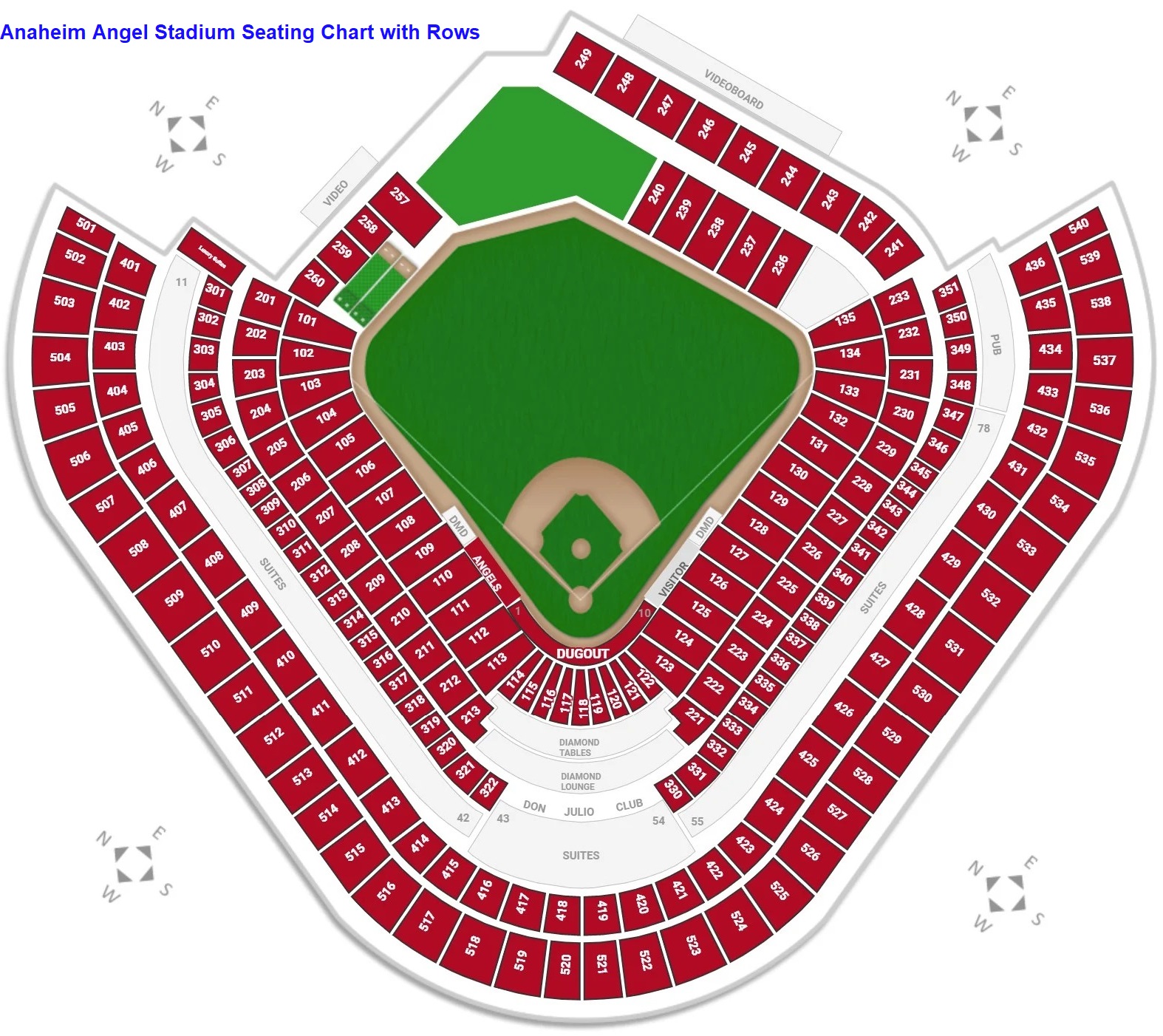With the help of the Anaheim Angel stadium seating chart with rows, seats can be found very easily in a specific row. The dugout location of the Los Angeles Angels team and visitor team is clearly depicted on the map. This image is very useful to book the best view seats in advance. Diamond tables, Diamond lounge, club seats, pub, and suite location are mentioned on the map. Direction signs, pitch, and videoboards are also depicted on the Angel Stadium of Anaheim map.