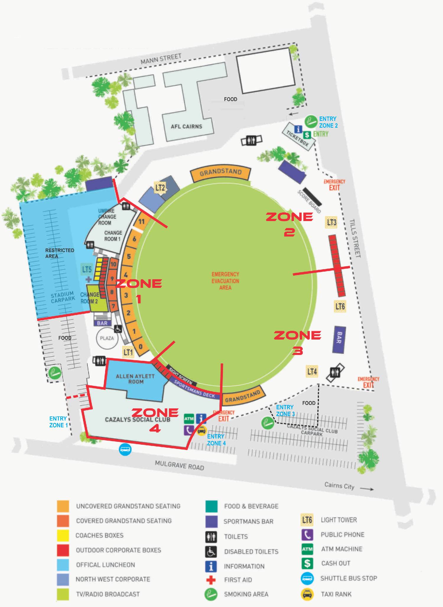 All entry Gates and emergency exits are clearly marked on the map. The seating area of the map is divided into zone and these zones are drawn on the map. Car parking area, food court, restricted areas, Emergency evacuation area, ticket box office, etc are clearly depicted on the Cazalys Stadium map shows Grandstand, sightscreen, scoreboards, washrooms, teams zone, bar location.Map contains the location of nearby streets and entry points of the stadium making it very convenient for the visiting navigating to visit the stadium.