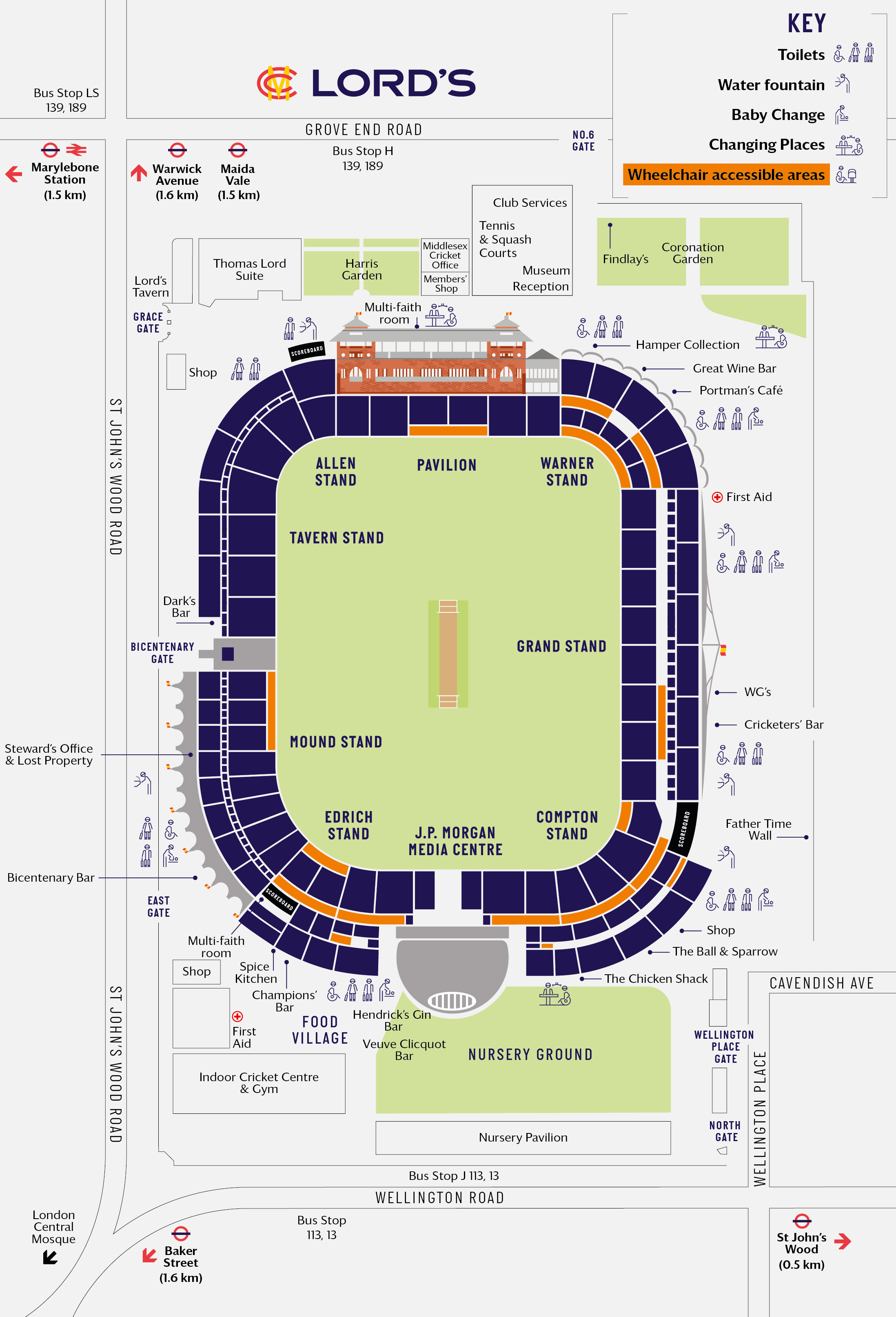 Nearby roads, underground station, bus stops, shops, first aid location, toilets, water fountains, wheelchair accessible area and other important details are also located on the above map.
