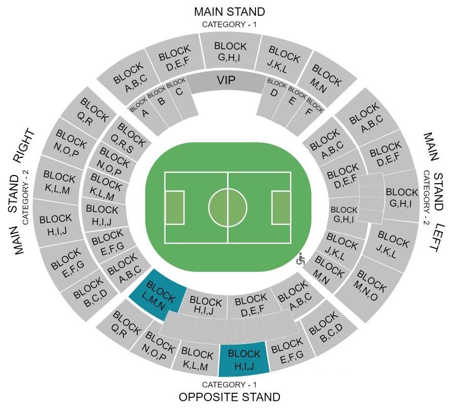 All the main stands, blocks, and categories are clearly depicted on the map. Block numbers are already marked on the map so that spectators can find their seats in no time. Football ground and pitch location are shown on the map so that visitors can book the best view seats of Jawaharlal Nehru Stadium Goa.