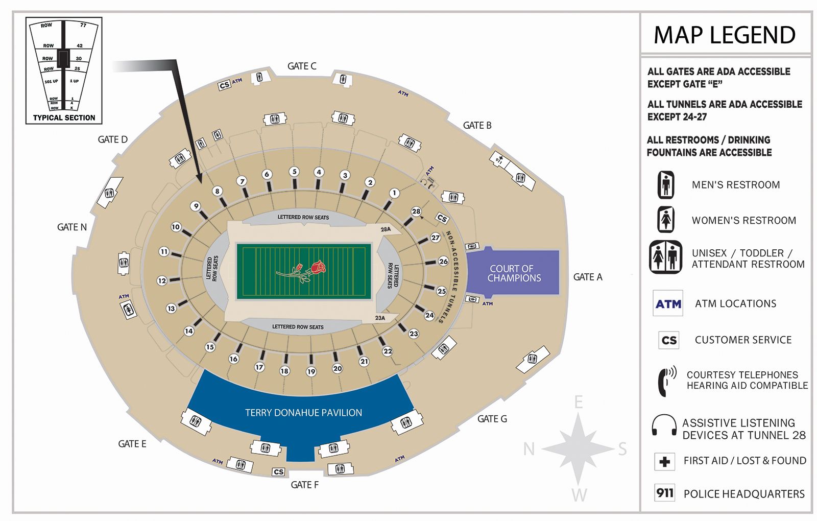 Rose Bowl stadium is a big outdoor stadium and it can accommodate around 90 thousand spectators. During High voltage events, the stadium gets very crowded and it is very difficult to find seat in the stadium. Rose bowl Stadium seating chart comes in very handy to locate seat inside the stadium. The entry and exit gates of the stadium are clearly depicted on the map along with seating chart and rows. All the designs are also mentioned on the right side of the map so that visitors can find all the amenities of the stadium easily. ATM location, restroom location, Customer service and first aid location is clearly marked on the map.