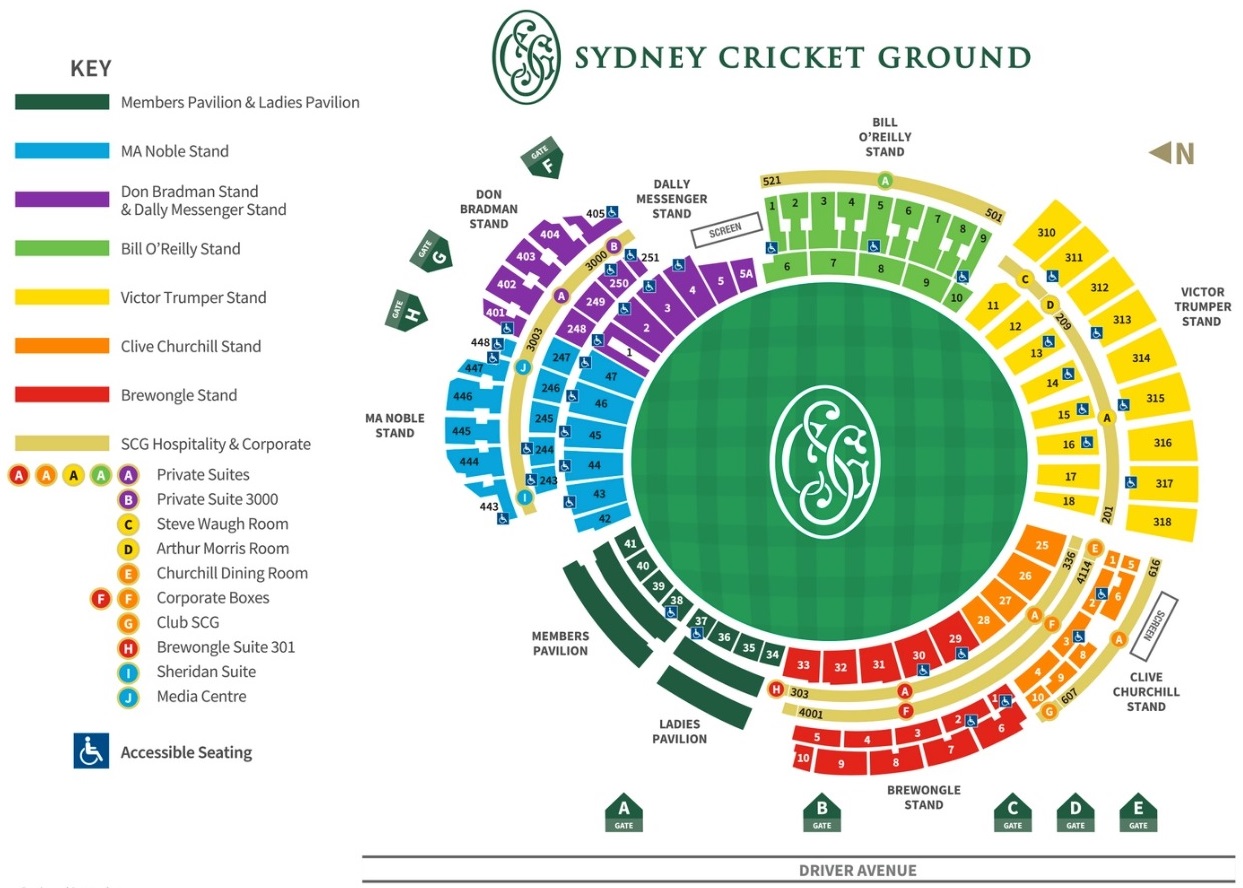 Sydney cricket ground entry Gates and exit Gates are mentioned on the map along with other important information. the nearby road is also drawn on the map. Accessibility stand screen location and pitch location help to find the best view seats while booking tickets. It is a floodlight Wikipedia stadium and it helps in hosting tonight’s matches.