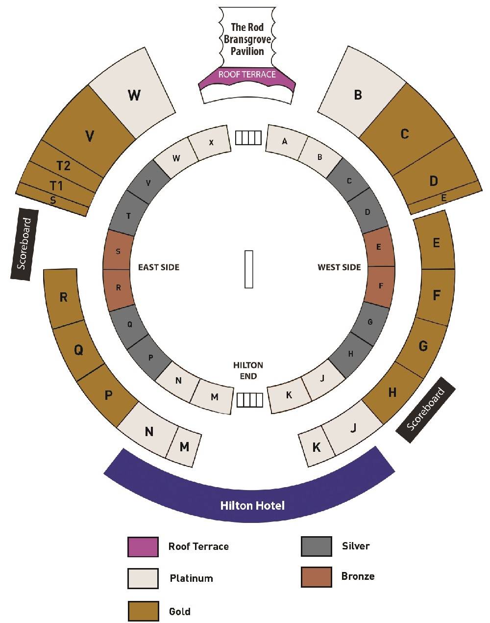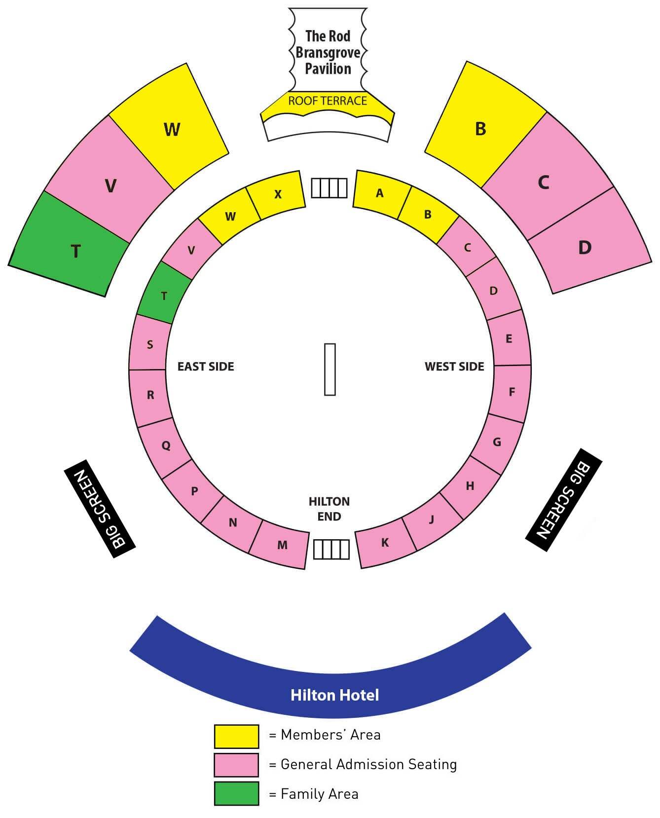 Stadium seating capacity is 15000 and during high voltage matches or international matches stadium seating capacity is increased up to 25000 by adding temporary arrangements. We are adding Ageas Bowl stadium map with extended seating and without temporary seating. During international matches and high voltage matches, it is tough to find seats in the stadium.  Rose Bowl Stadium is depicting all the important details like pavilions, stands, pitch location, screen, scoreboard, roof terrace area, etc. Below maps are also showing members area, general seating area, family area, etc. Gold area, bronze area, silver area and platinum area also divided in the map.