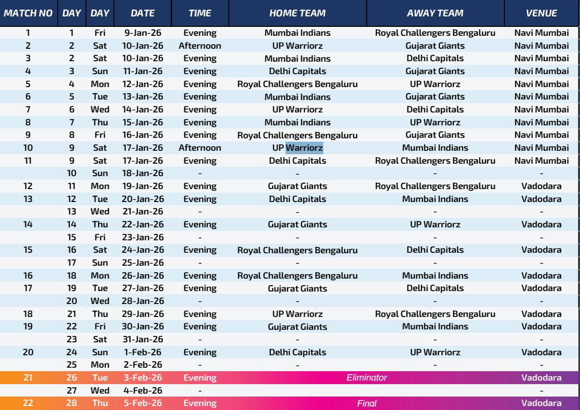 | Friday 9 January 2026 | Mumbai Indians vs Royal Challengers Bengaluru | DY Patil Stadium Navi Mumbai | 7.30 PM |