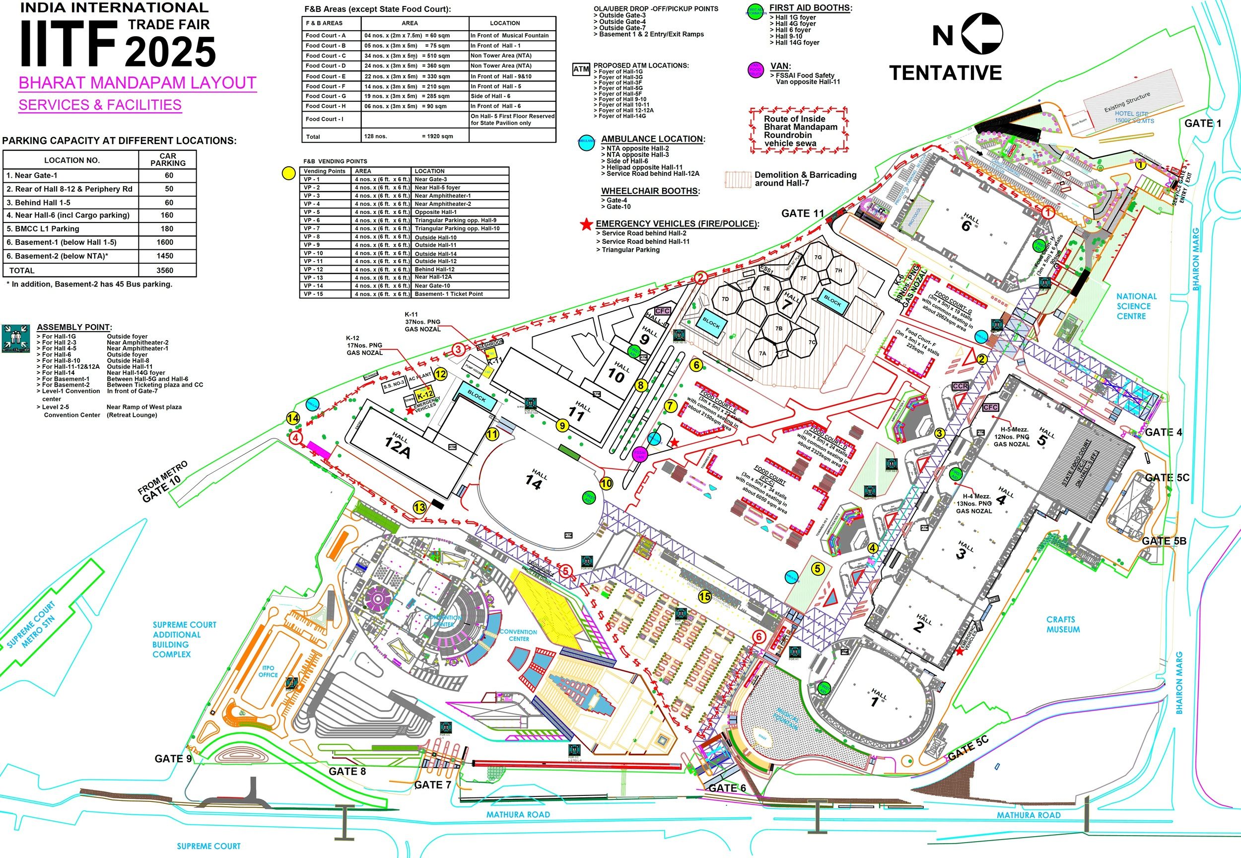 Visitors can see the location of car parking lots, food & beverage areas, vending points, drop off & pick up point of cabs, first aid booths, ambulance, route map, etc. The layout of the Pragati Maidan is quite helpful while visiting the venue for the trade fair 2025. Bharat Mandapam is newly built and most of the visitors might not be aware of the location of halls and other facilities. We have also shared the layout map in PDF format, which is printable.